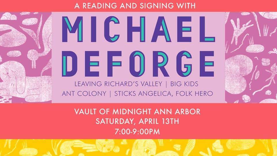 Michael DeForge appears at Vault of Midnight on Saturday, April 13, 2019 at 7 PM for a reading and book signing to launch Leaving Richard’s Valley, his new graphic novel from Drawn & Quarterly!