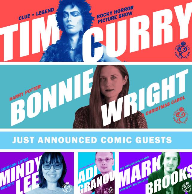 Rose City Comic Con has opened ticket sales for 2019! Plus they’ve announced Tim Curry and Bonnie Wright as the first celebrity guests and Adi Granov (Iron Man, Darth Vader), Mark Brooks (Han Solo, Avengers), and Mindy Lee (Crimson Lotus, Bounty) are the first comic creators! Join them at the Oregon Convention Center on September 13-15th.