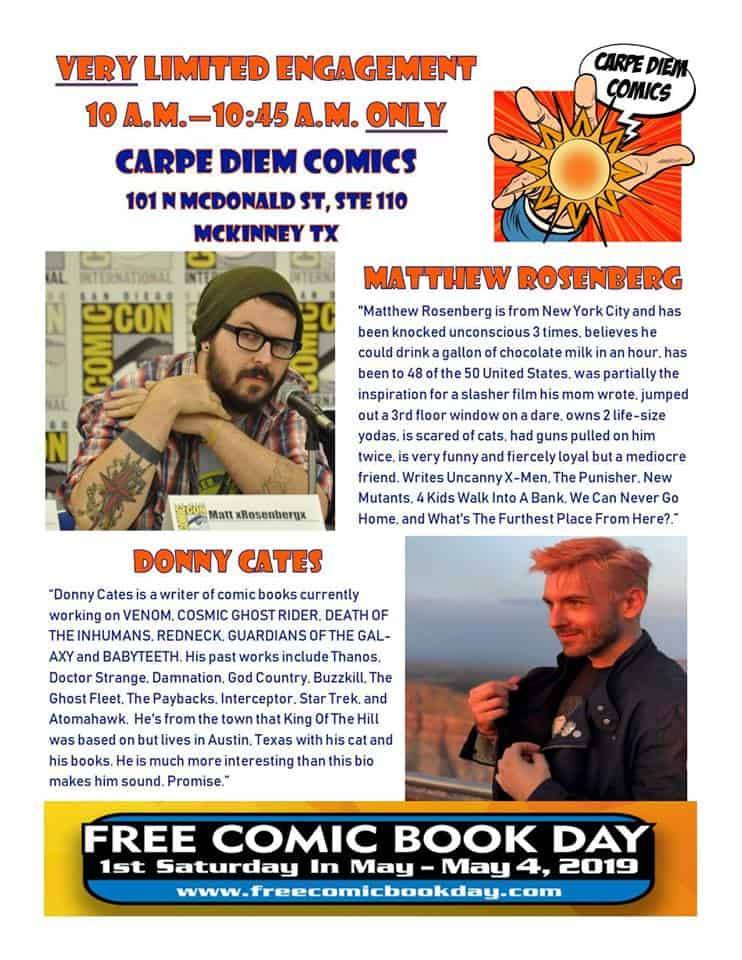 Meet writers Matthew Rosenberg (Uncanny X-Men, The Punisher, New Mutants, 4 Kids Walk Into A Bank) and Donny Cates (Venom, Guardians of the Galaxy, Cosmic Ghost Rider, Thanos) on Saturday, May 4th! They will be doing a whirlwind tour of the DFW area on Free Comic Book Day. They will be at Carpe Diem from 10 a.m. until 10:45 a.m. SHARP!