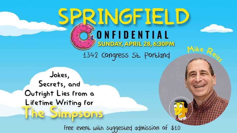 Mike Reiss, former Simpsons head writer and producer, appears on Sunday, April 28, 2019 at 6:30 PM to sign Springfield Confidential: Jokes, Secrets and Outright Lies from a Lifetime Writing for the Simpsons. Register for tickets at the link…