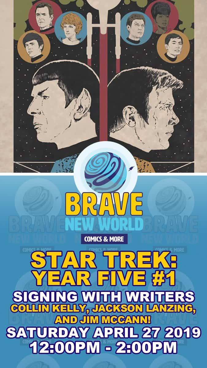 Writers Collin Kelly, Jackson Lanzing, and Jim McCann appear at Brave New World Comics on Saturday April 27, 2019 from noon till 2 PM to sign Star Trek: Year Five #1 from IDW Publishing.
