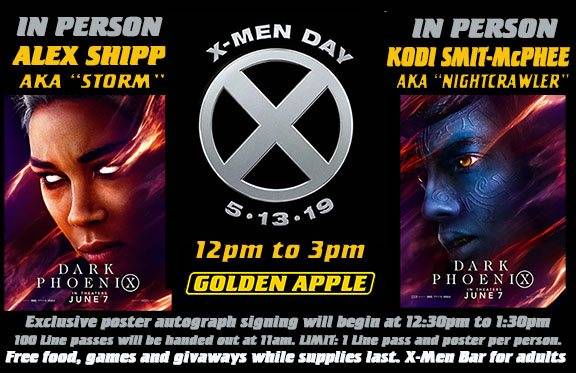 JUST ADDED: Free Limited Edition Poster signing with Alexandra Shipp aka “STORM” and Kodi Smit–mcphee aka “NIGHTCRAWLER” from 12:30-1:30pm only. The first 100 fans that show up to Golden Apple at 11am will get line passes. 1 pass per person. 1 poster per person.