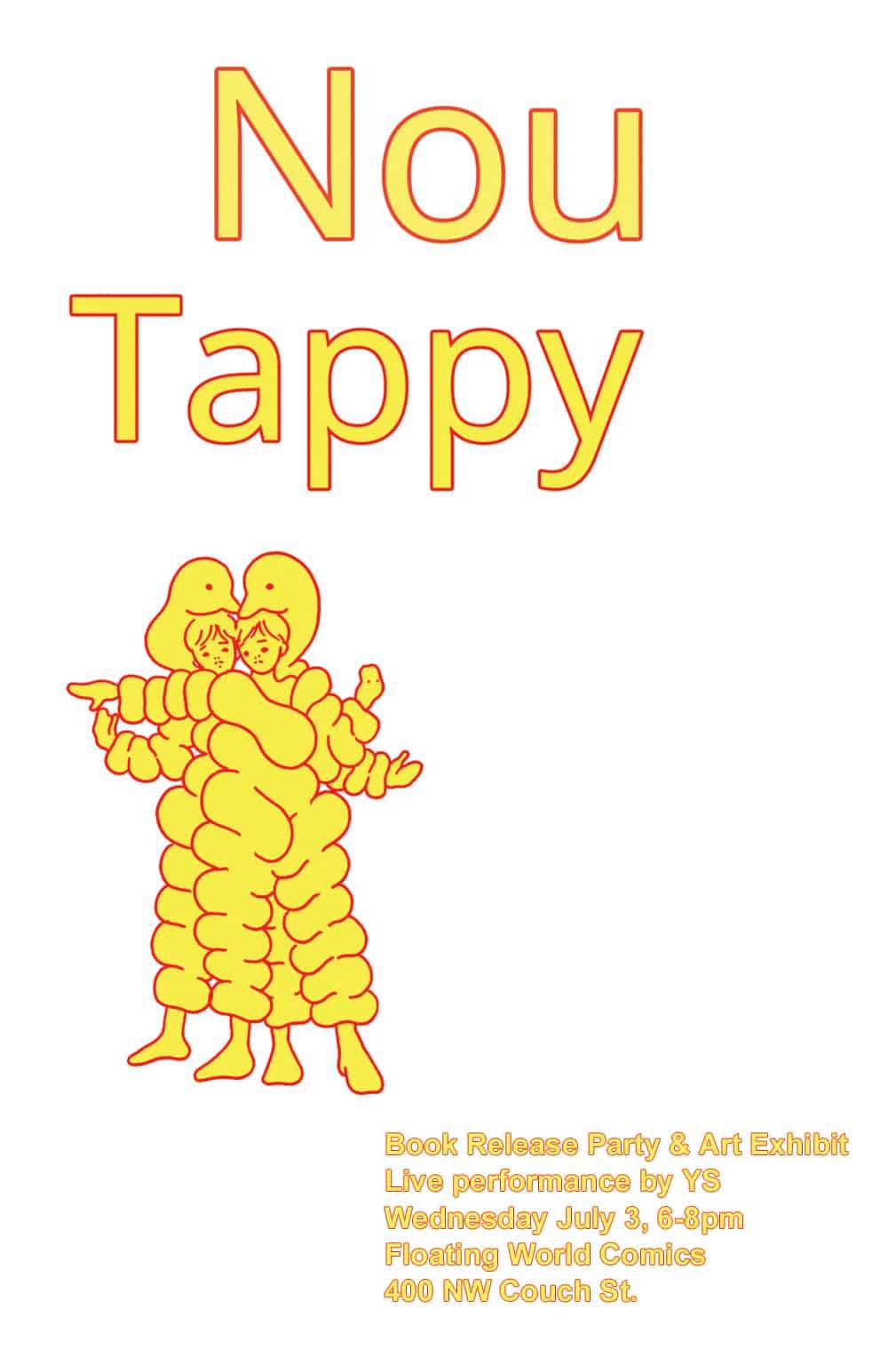 Floating World Comics is excited to host a book release party and art exhibit with NOU for her new book TAPPY on Wednesday, July 3rd from 6 PM – 8 PM. The book signing will be followed by a live performance by her rap duo YS.