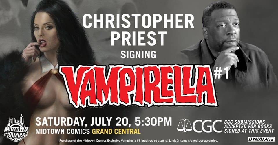 Writer Christopher Priest (Deathstroke, Black Panther, Quantum & Woody) appears at Midtown Comics Grand Central on Saturday, July 20th at 5:30 PM to celebrate the release of Vampirella #1! This is an open signing and we recommend showing up early, just to be safe. Purchase of the Midtown Comics Exclusive Vampirella #1 required. Limit 3 items signed per attendee.