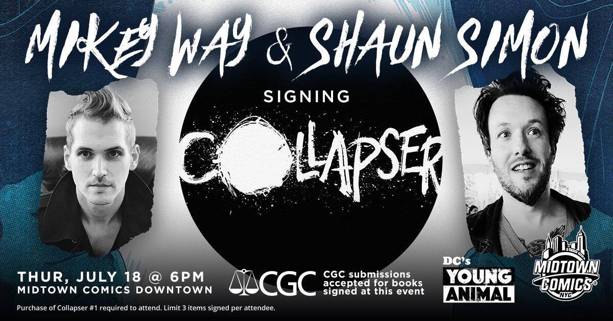 Writers Mikey Way (My Chemical Romance) and Shaun Simon join us from Midtown Comics Downtown on Thursday, July 18th at 6 PM to celebrate the release of Collapser #1! This is an open signing and Purchase of Collapser #1 required. Limit 3 items signed per attendee.