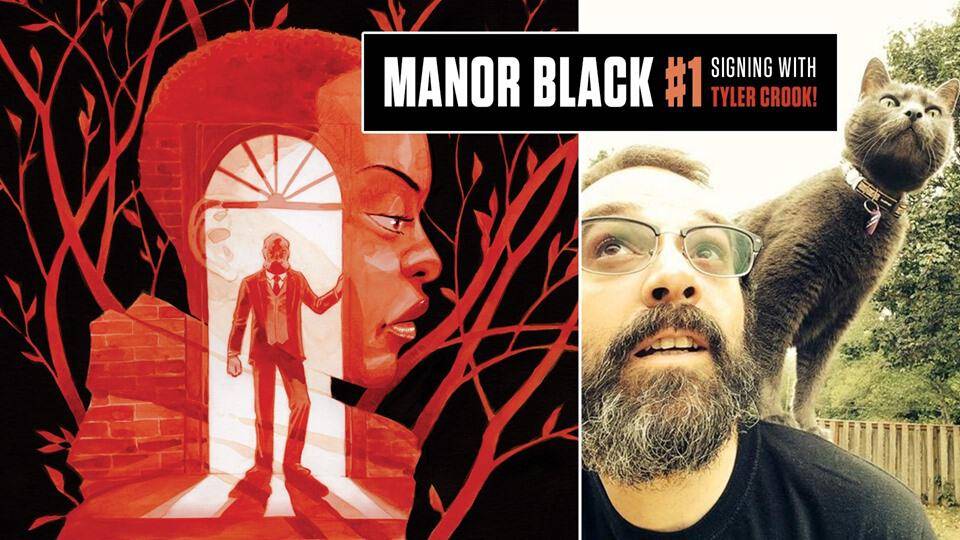 Tyler Crook, artist of Harrow County, Witchfinder, B.P.R.D, and many more, appears on Wednesday, July 31st, 2019 at 5 PM at the Milwaukie TFAW to celebrate the launch of Manor Black #1 from Dark Horse!