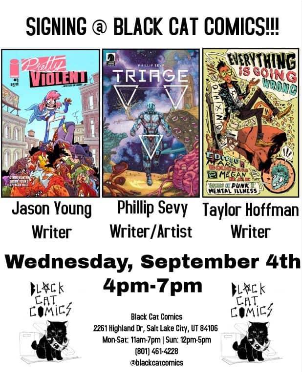 Join Black Cat Comics for a signing with Jason Young (Pretty Violent, I Hate Fairyland), Phillip Sevy (Triage, Tomb Raider, The House, Freeze), and Taylor Hoffman (Everything Is Going Wrong – “Depression Meal #5”, All We Ever Wanted) on Wednesday, Sept. 4th from 4pm-7pm.