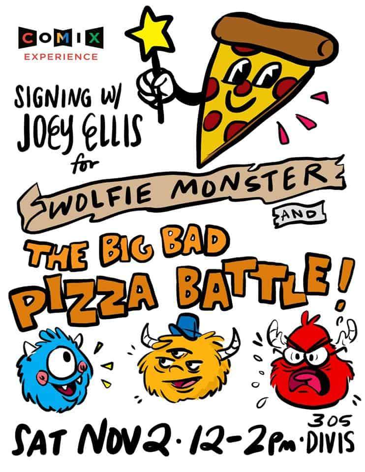 Joey Ellis, creator of WOLFIE MONSTER AND THE BIG BAD PIZZA BATTLE, appears at Comix Experience on Saturday, November 2nd from Noon till 2 PM!