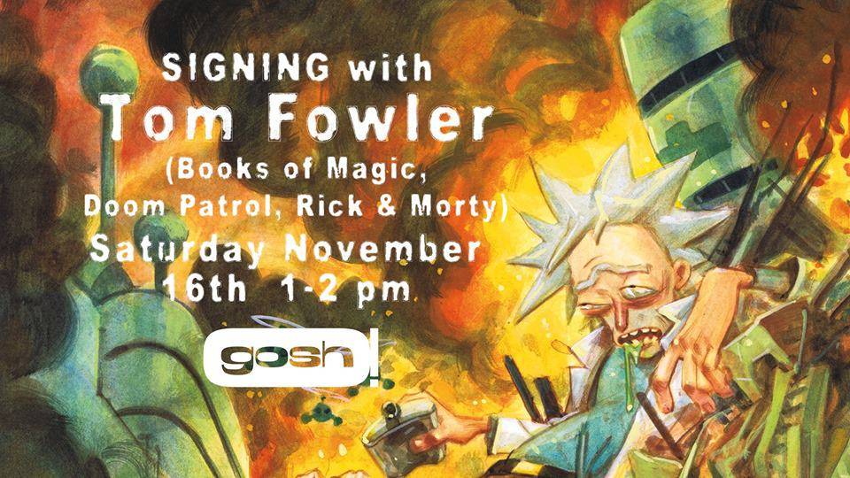 Artist Tom Fowler (Books of Magic, Rick & Morty, Doom Patrol) signs at Gosh Comics on Saturday the 16th November from 1 PM – 2 PM.