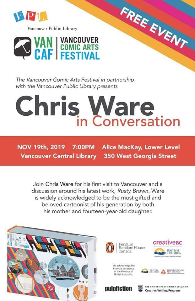 Join Chris Ware for his first visit to Vancouver on Tuesday, November 19, 2019 at 7 PMĀ for a discussion around his latest work, Rusty Brown. Ware is a continuously innovate creator telling important personal works in new fascinating ways. His latest graphic novel engages in a telling of the honest complexities of the human condition and exploring anxieties and triumphs. Robin McConnell, President of VanCAF will host. This free event is hosted by the Vancouver Comic Arts Festival with support from the Vancouver Public Library, Pulp Fiction books and University of British Columbia Creative Writing.
