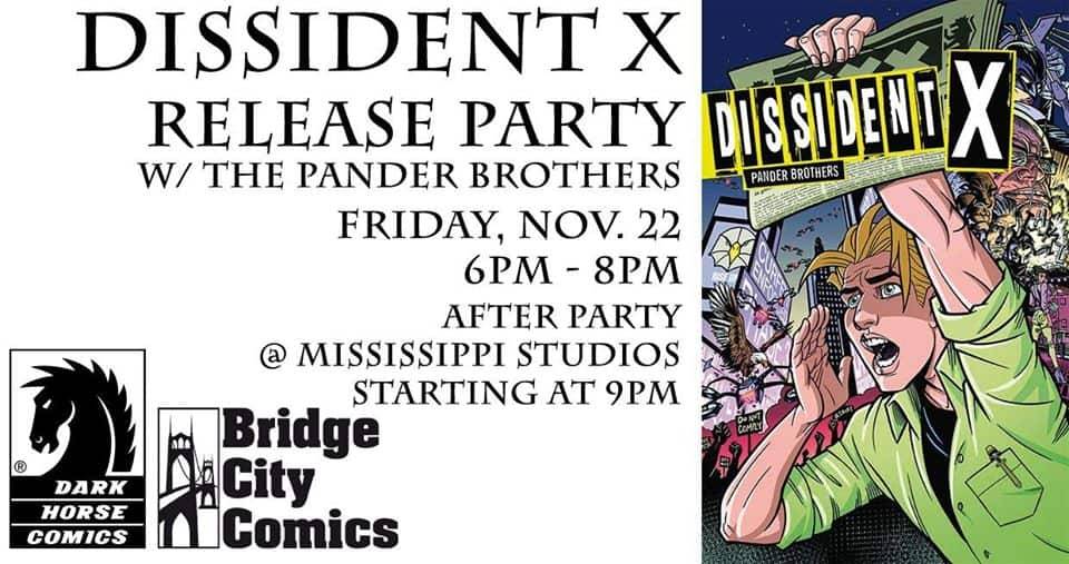 Immediately following their book signing at Bridge City Comics, join the Pander Brothers and friends for a celebration of their new graphic novel release DISSIDENT X, 9-11pm at Mississippi Studios outdoor back patio, with guest DJ PO spinning a 90s soundtrack inspired by the Pander Brothers 424-page sci-fi political thriller, and graphic novel video projections. Join the party and pick up your signed copy of DISSIDENT X.