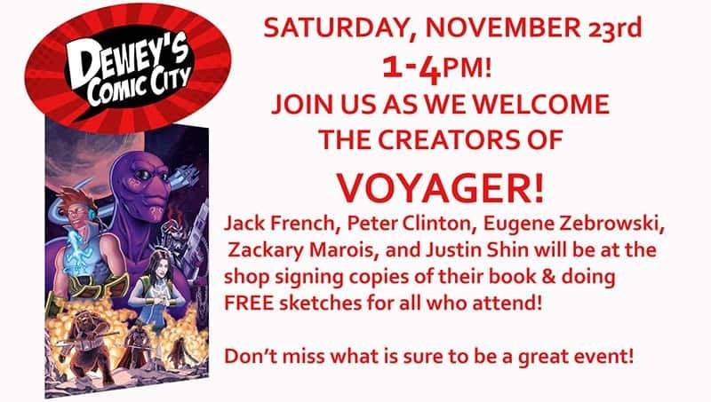 Dewey’s Comic City welcomes artists Jack French, Peter Clinton, Eugene Zebrowski, Zackary Marois, and Justin Shin on Saturday, November 23rd from 1 PM – 4 PM to sign VOYAGER.