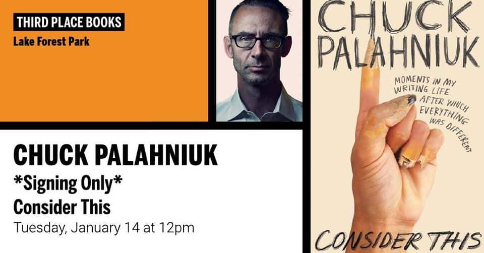Author Chuck Palahniuk signs copies of this new book Consider This: Moments in My Writing Life After Which Everything Was Different on Tuesday, January 14, 2020 from noon till 3:00 PM.