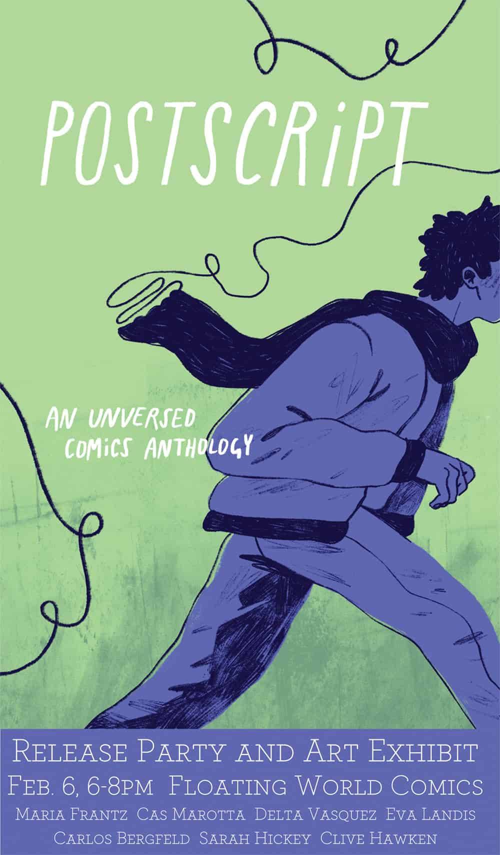 Maria Frantz, Cas Marotta, Delta Vasquez, Carlos Bergfeld, Sarah Hickey, Clive Hawken, and Eva Landis appear at Floating World Comics on Thursday, February 6, 2020 at 6 PM for the Postscript release party and art exhibit.