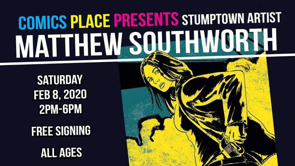Artist Matthew Southworth signs STUMPTOWN at Comics Place on Saturday, February 8, 2020 from 2 PM – 6 PM.