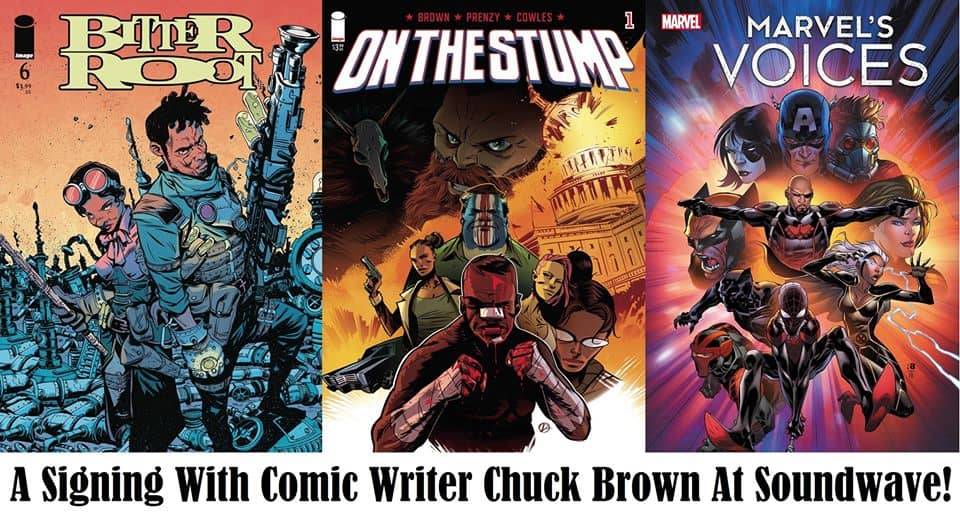 Writer Chuck Brown appears at Soundwave Comics on Saturday, March 7, 2020 from 11 AM – 4 PM for a signing. His titles include The Punisher, Black Panther, Rotten Apple, smash hit Bitter Root, The Quiet Kind, On The Stump, and Marvel’s Voices!