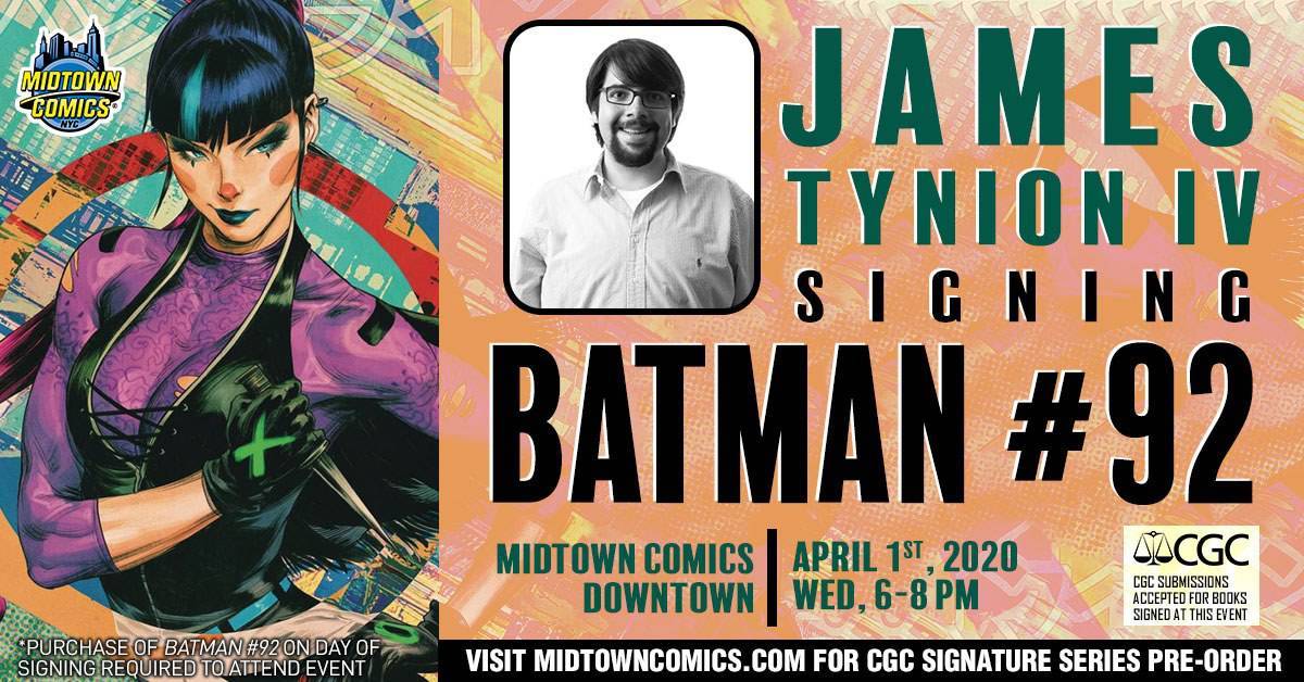 Writer James Tynion IV signs Batman #92 on Wednesday, April 1st at Midtown Comics from 6 PM – 8 PM.