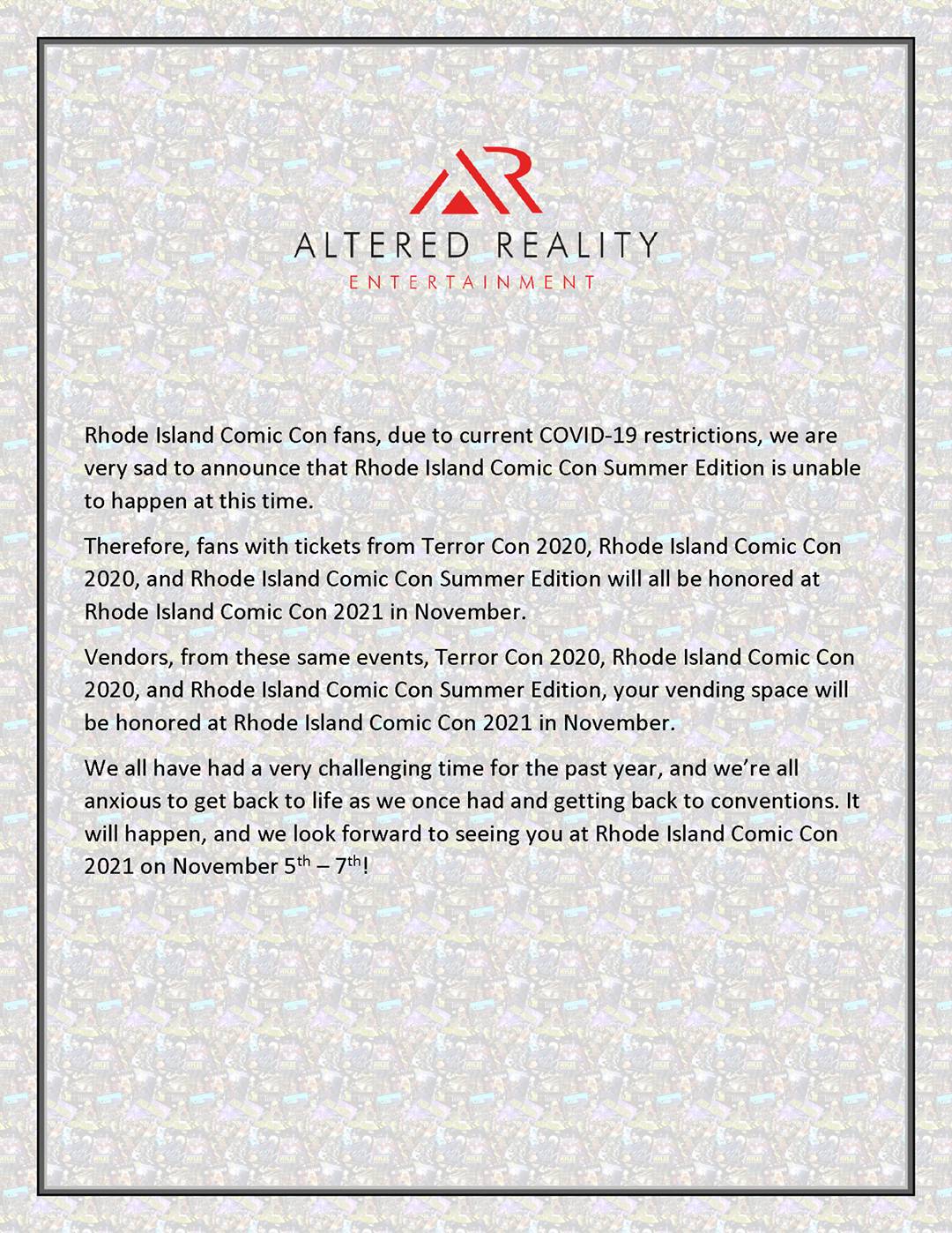Home Category Comic Books Rhode Island Comic Con summer show Cancelled! CategoryComic BooksMusicCosplayComic StripsWebcomicsAnimeScene Around the WebConvention NewsHorrorCollectiblesScience Fiction and FantasyGamingSportsOtherAnimationMangaMoviesTelevisionVideo Games Rhode Island Comic Con summer show Cancelled! By Joe Fauvel - March 15, 2021 163 0 FacebookTwitterPinterestWhatsApp Visit Rhode Island Comic Con website HERE