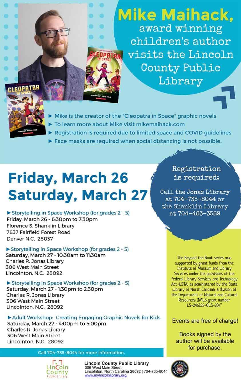 Mike Maihack, award winning creator of the “Cleopatra in Space” graphic novels visits the Lincoln County Public Library this weekend for a series of comics workshops. Mike will make appearances this Friday, March 26, at the Florence S. Shanklin Library in Denver, NC and at the Charles R. Jonas Library in Downtown Lincolnton, NC on Saturday, March 27!