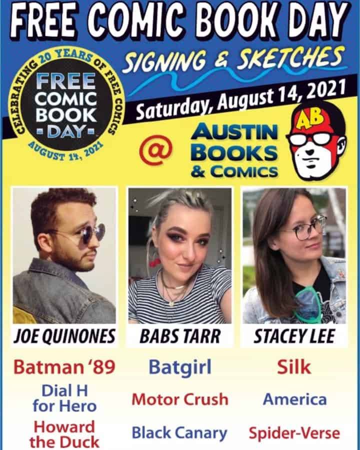 Joe Quinones, Babs Tarr, and Stacey Lee sign at Austin Books and Comics on Saturday, August 14, 2021 for Free Comic Book Day!
