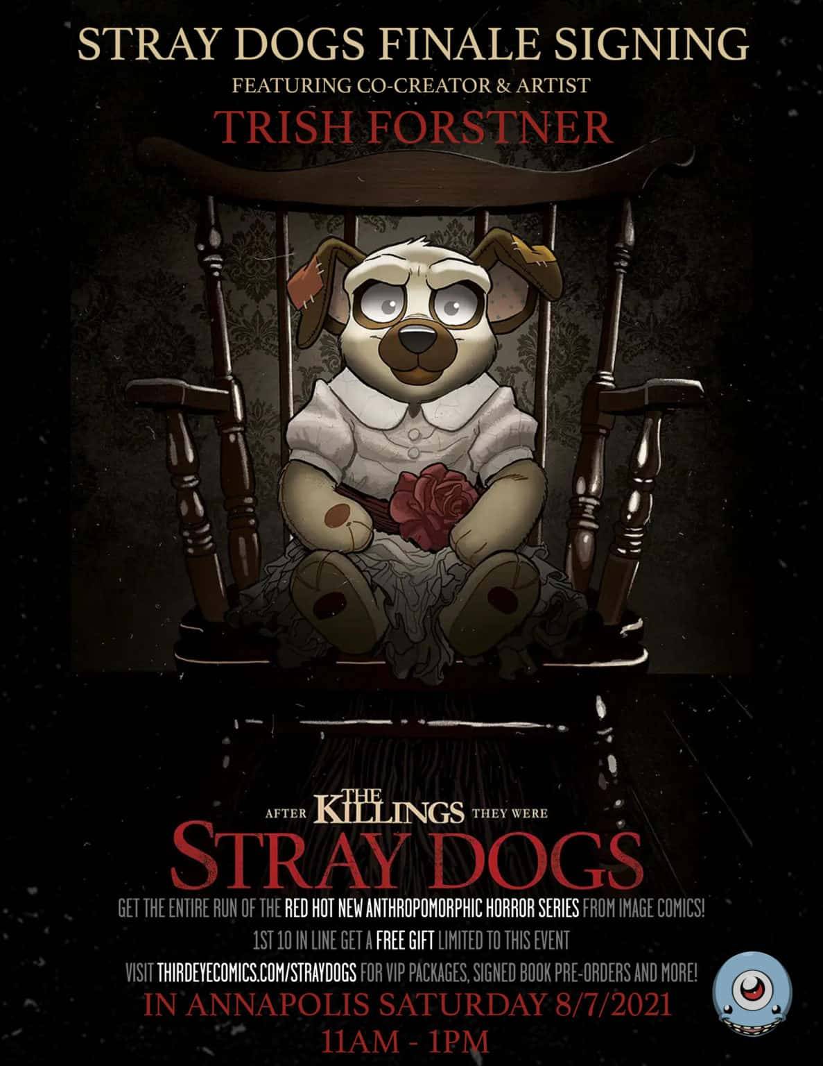 Trisha Forstner, artist and co-creator of Stray Dogs, signs the final issue at Third Eye Comics on Saturday, August 7th from 11am – 1pm.