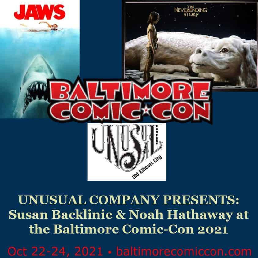 Unusual Company, in association with CS&D, are pleased to announce celebrity guests Susan Backlinie and Noah Hathaway at this year’s Baltimore Comic-Con on October 22-24, 2021. Tickets are on sale now!