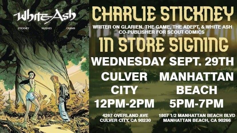 Writer Charlie Stickney signs his new comic White Ash on Wednesday, September 29th at the Comic Bug from 12pm – 2pm in Culver City and 5pm – 7pm in Manhattan Beach.