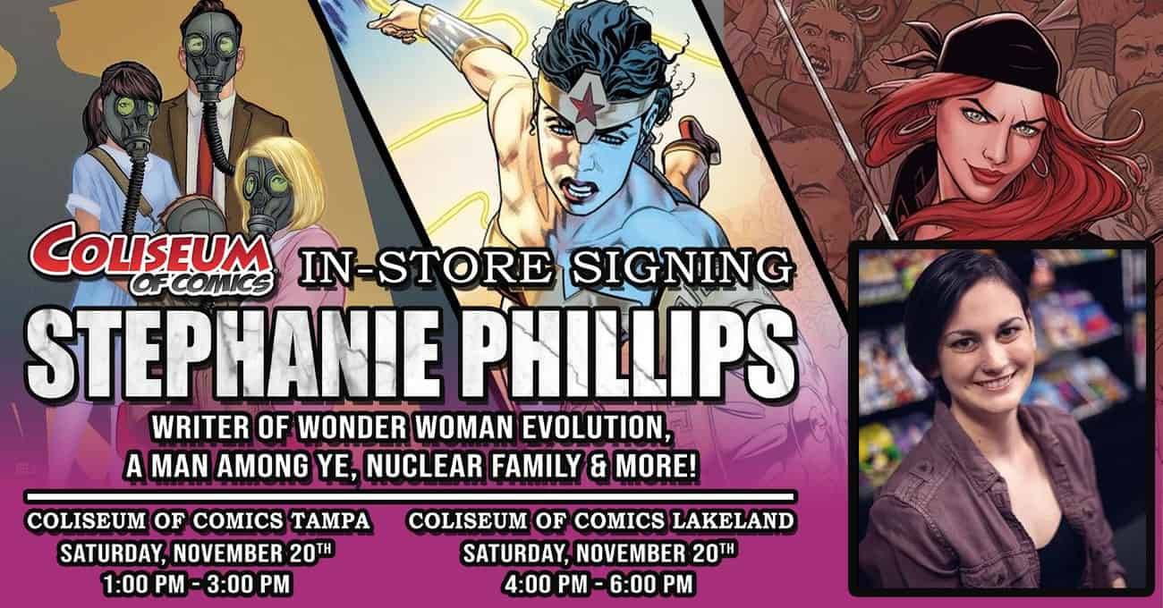 Stephanie Phillips, writer of Wonder Woman: Evolution, Harley Quinn, A Man Among Ye, Nuclear Family & more, will be signing THIS SATURDAY November 20th at Coliseum of Comics New Tampa & Lakeland!