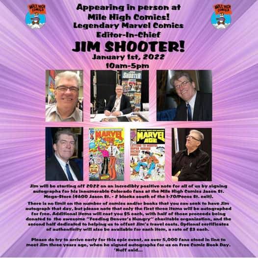 Home Category Comic Books CO – Jim Shooter Signing CategoryComic BooksDirectorySigning and Appearance ProfilesUnited StatesColorado CO – Jim Shooter Signing By Colin Solan - December 25, 2021 207 0 FacebookTwitterPinterestWhatsApp Jim Shooter appears at Mile High Comics in Denver, Co on Saturday, January 1, 2022 for a signing.
