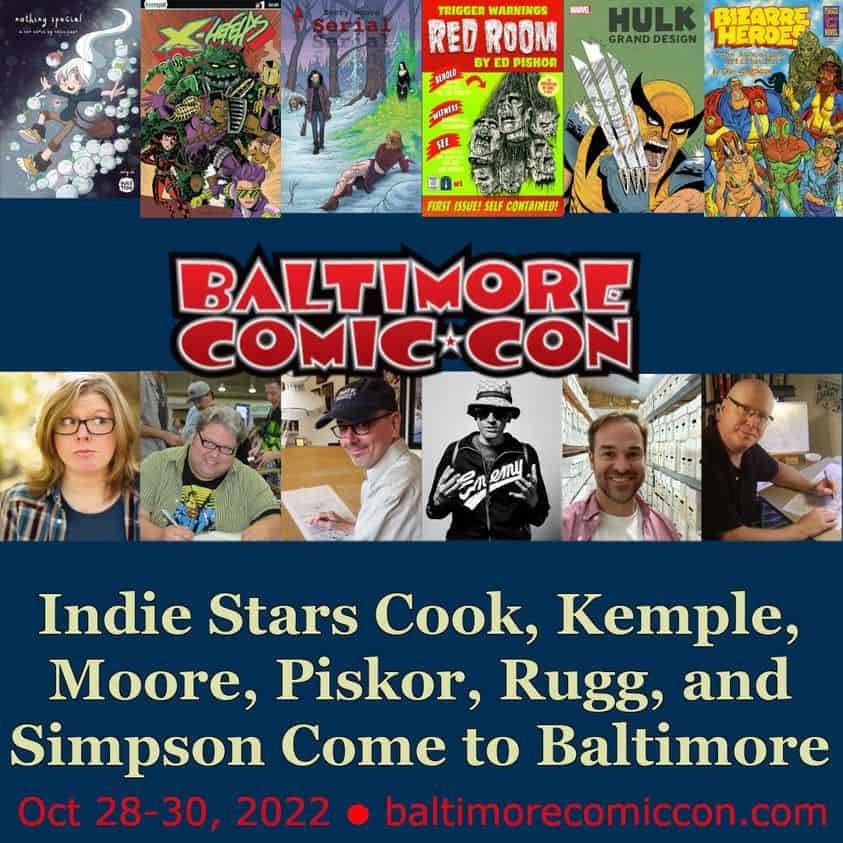 The Baltimore Comic-Con lights up the Inner Harbor this October 28-30, 2022 at the Baltimore Convention Center. The Baltimore Comic-Con prides itself on the breadth and depth of our comics guests, and are happy to feature creators with great indie comics cred in 2022: Katie Cook, Chris Kemple, Terry Moore, Ed Piskor, Jim Rugg, and Don Simpson. Tickets are on sale now!