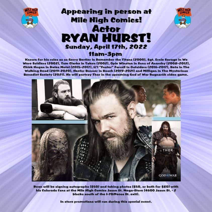 Actor Ryan Hurst (Sons of Anarchy, The Walking Dead, The Mysterious Benedict Society) will be at Mile High Comics’ Jason Street Mega Store for a meet and greet on Sunday, April 17th from 11:00AM-4:00PM. Special Store sales will be running during these special Holiday hours!