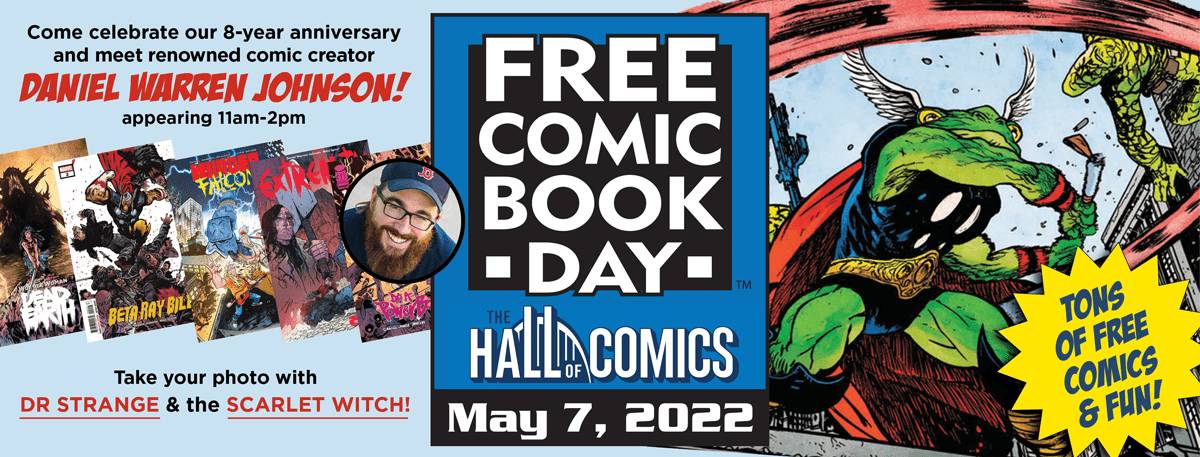 IT’S BACK – We are THRILLED to officially announce our 8th annual Free Comic Book Day at The Hall! Our special guest will be the incredibly talented Daniel Warren Johnson, appearing from 11am-2pm! Mr. Johnson is the writer/artist of Extremity, Wonder Woman: Dead Earth, Murder Falcon, the recent Beta Ray Bill series, and the upcoming Do a Powerbomb for Image Comics and Jurassic League for DC.