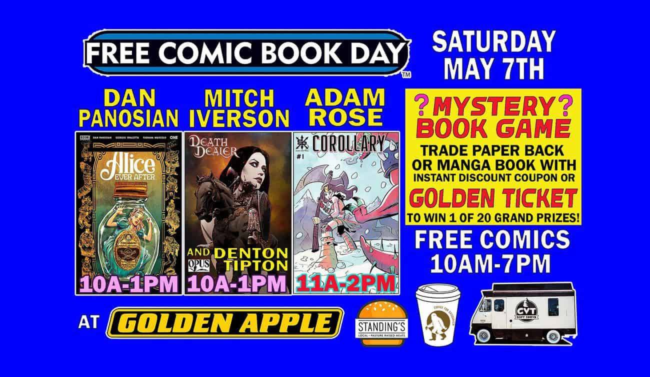 Dan Panosian, Mitch Iverson, Denton Tipton, and Adam Rose sign at Golden Apple Comics to celebrate Free Comic Book Day on Saturday, May 7, 2022!