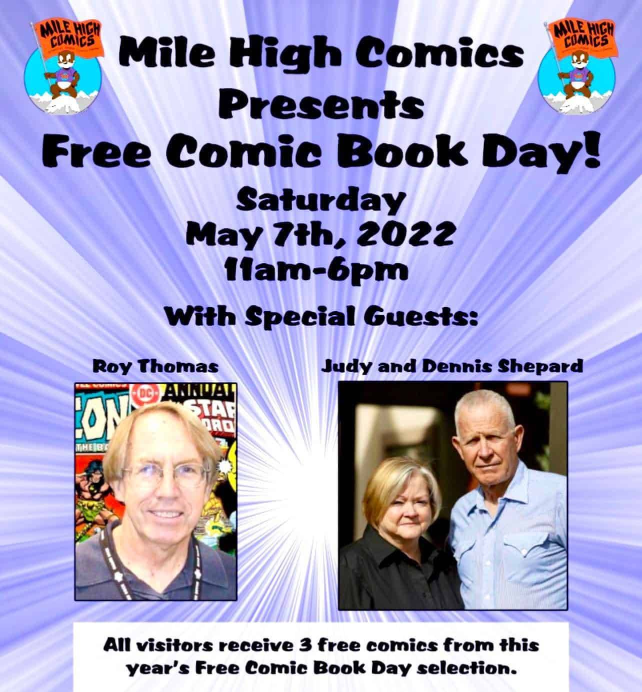 Writer/editor Roy Thomas (Avengers, X-Men, Conan the Barbarian) appears alongside Judy and Dennis Shepard at Mile High Comics on Saturday, May 7, 2022 to celebrate Free Comic Book Day.