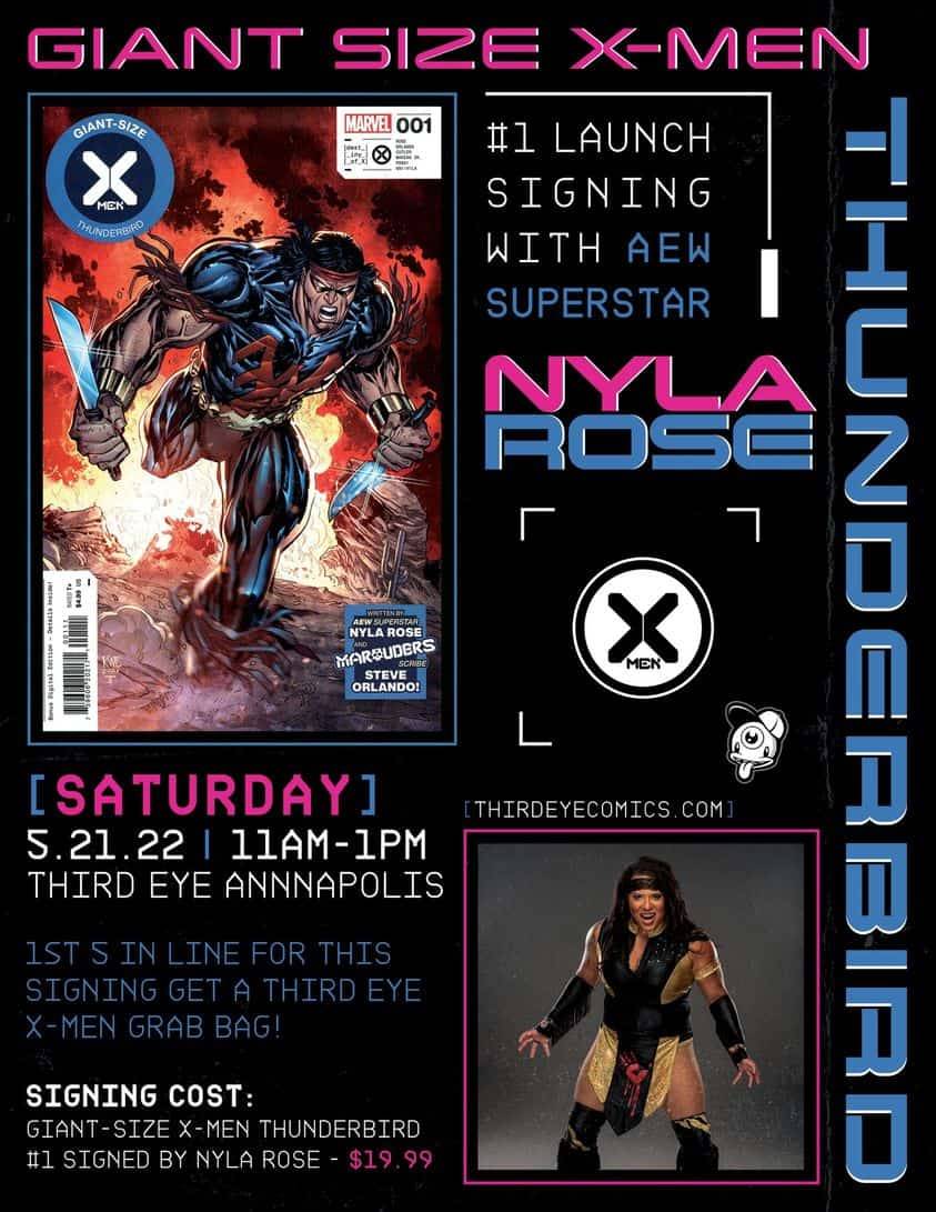 Join us at Third Eye ANNAPOLIS on 5/21 to meet AEW Superstar NYLA ROSE! She’ll be signing copies of her comic writing debut in GIANT SIZE X-MEN THUNDERBIRD #1!