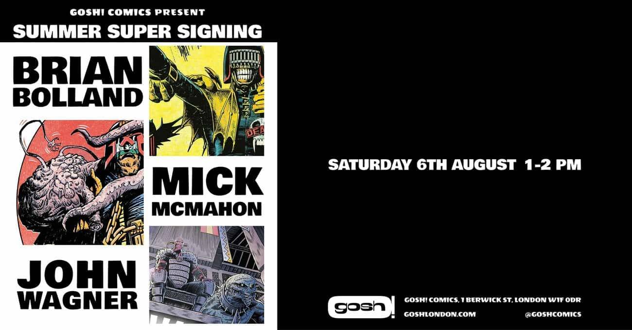 Gosh Comics has an action packed afternoon on Saturday 6th August, 1-2pm, when we welcome three comics legends to the shop for a Summer Super Signing. Brace yourselves, because Brian Bolland, Mick McMahon and John Wagner will all be here!
