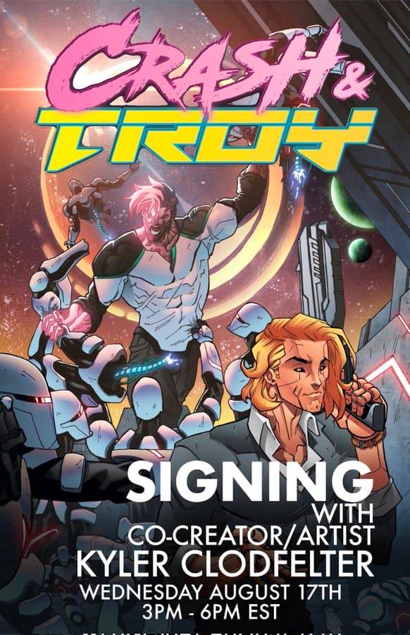 Artist Kyler Clodfelter will sign copies of CRASH & TROY this Wednesday, August 17th from 3-6pm at Liberty City Comics in Roseville, Michigan! He will also be doing $5 sketches on the spot for anyone who wants as well. Be sure to spread the word and to come on through!