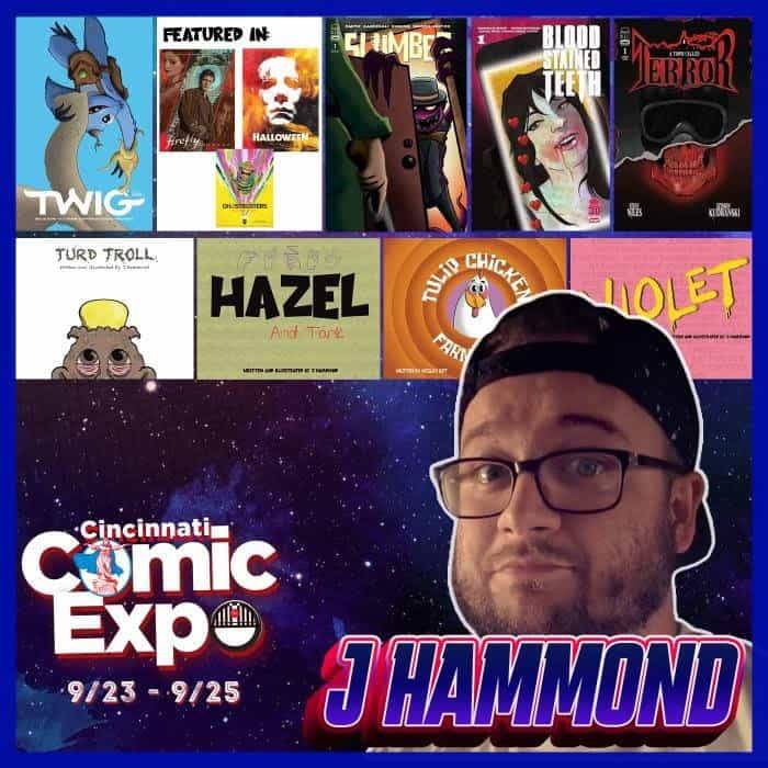 Artist and author J Hammond is the most recent guest to be announced coming to the 2022 Cincinnati Comic Expo! He has produced officially licensed artwork for properties like Rick and Morty, Steven Universe, Star Wars, Marvel, GPK and more. His artwork has also been used with numerous trading card companies. He has been published with Printed in Blood art books, comic covers for Image, Twig, Blood Stained Teeth, Slumber, and others. He has written and illustrated such books as Turd Troll, Hazel and Tank, and Violet.