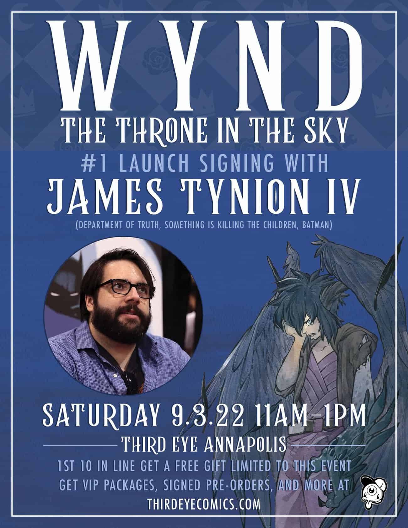 Writer James Tynion IV (Batman, Something is Killing the Children) appears at Third Eye Comics on Saturday, Sep. 3rd from 11am till 1pm to sign Wynd: The Throne in the Sky #1 from Vault Comics.