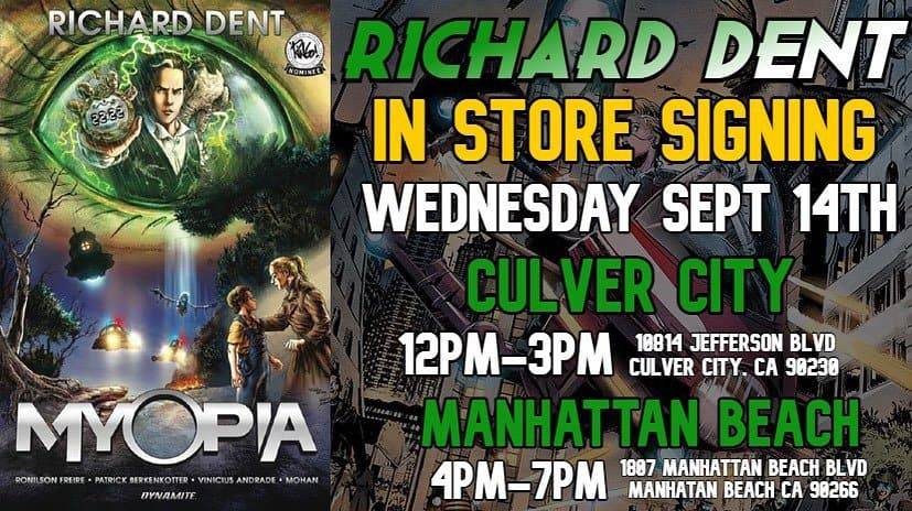 Home Category Comic Books CA – Myopia Signing CategoryComic BooksDirectorySigning and Appearance ProfilesUnited StatesCalifornia CA – Myopia Signing By Colin Solan - September 12, 2022 111 0 FacebookTwitterPinterestWhatsApp Richard Dent signs his graphic novel Myopia on Wednesday, September 14th at The Comic Bug in Culver City from 12-3pm and in Manhattan Beach from 4-7pm.