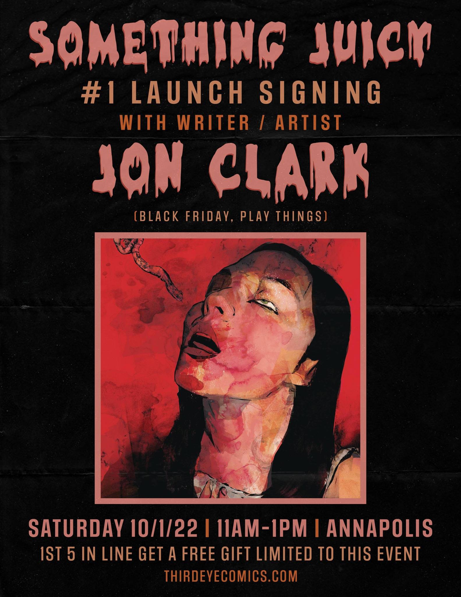 Third Eye Faithful, get ready for back to school with this dark new high school drama – SOMETHING JUICY #1!! Get the gossip from series writer / artist JON CLARK (Black Friday, Playthings) when you get him to sign your copy! You don’t have to dig for the dirt on this one, we want YOU to join us at Third Eye ANNAPOLIS on Saturday 10/1 from 11AM-1PM to get some sweet signed comics!