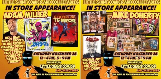 Home Category Comic Books NH – Holiday 2022 Signing CategoryComic BooksDirectorySigning and Appearance ProfilesUnited StatesNew Hampshire NH – Holiday 2022 Signing By Colin Solan - November 20, 2022 182 0 FacebookTwitterPinterestWhatsApp Artists Adam Miller and Mike Doherty appear at Little Giant Comics in Salem, NH on Saturday, November 26th.