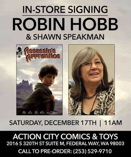 Action City Comics will be hosting a very special signing with authors, Robin Hobb and Shawn Speakman! Be here as they present the comic book adaptation release of Robin’s novel, Assassin’s Apprentice, on Saturday, December 17th at 11am.