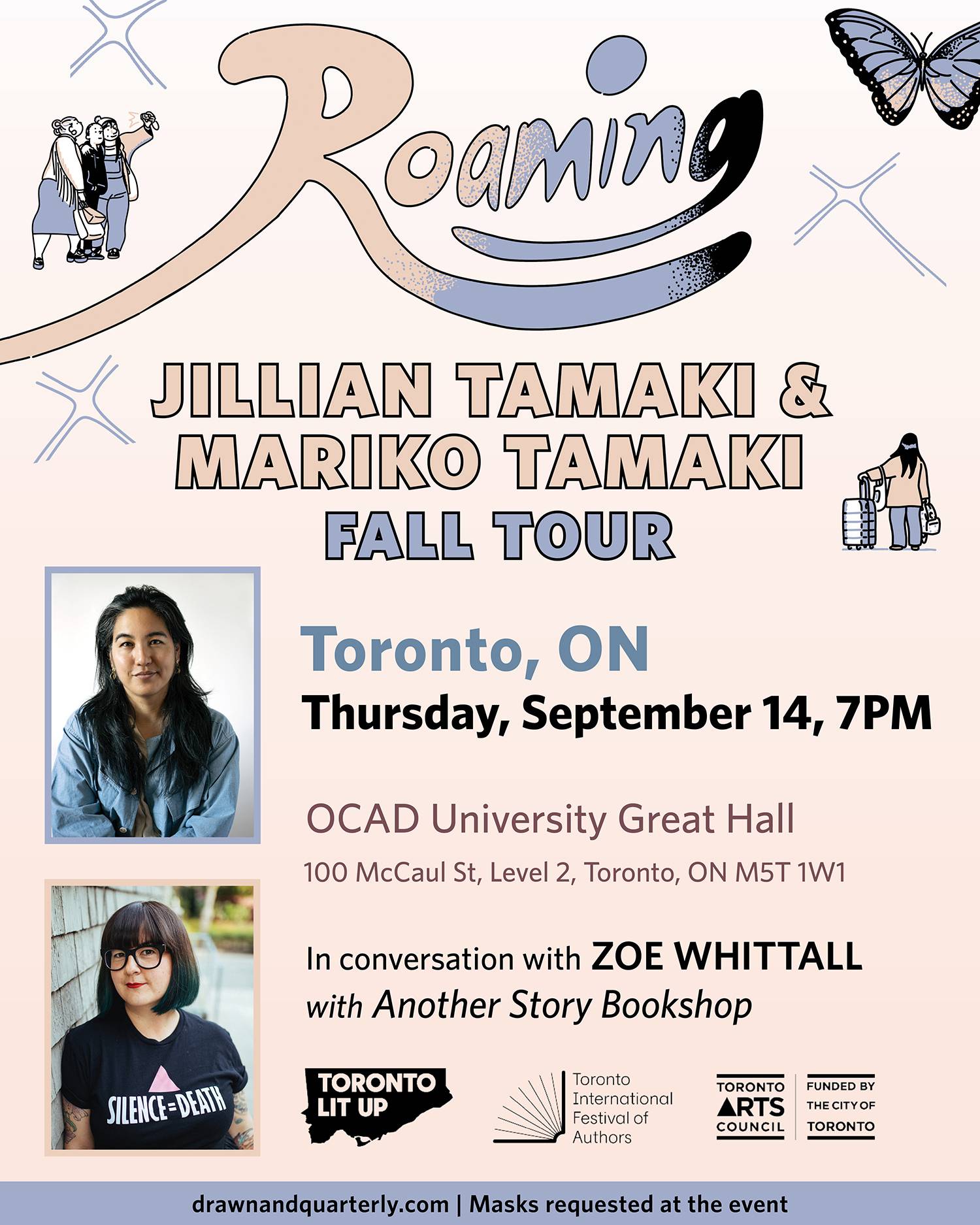 Join author-illustrator duo Jillian Tamaki and Mariko Tamaki for the launch of their latest graphic novel Roaming (Drawn & Quarterly). The event will take place on September 14 at 7pm ET at the OCAD University Great Hall. Jillian and Mariko will do a slideshow reading followed by a conversation and audience Q&A.